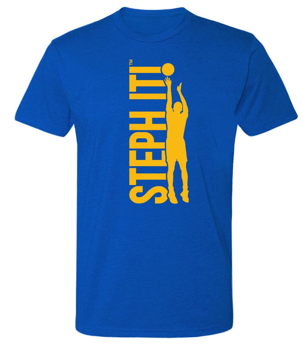 This premium tri-blend short sleeve shirt displays 'Steph It!' Design #5. The fabric weight is 4.5 ounces and made from 25% ring spun cotton, 25% rayon, and 50% polyester. Wash on cold and air dry.