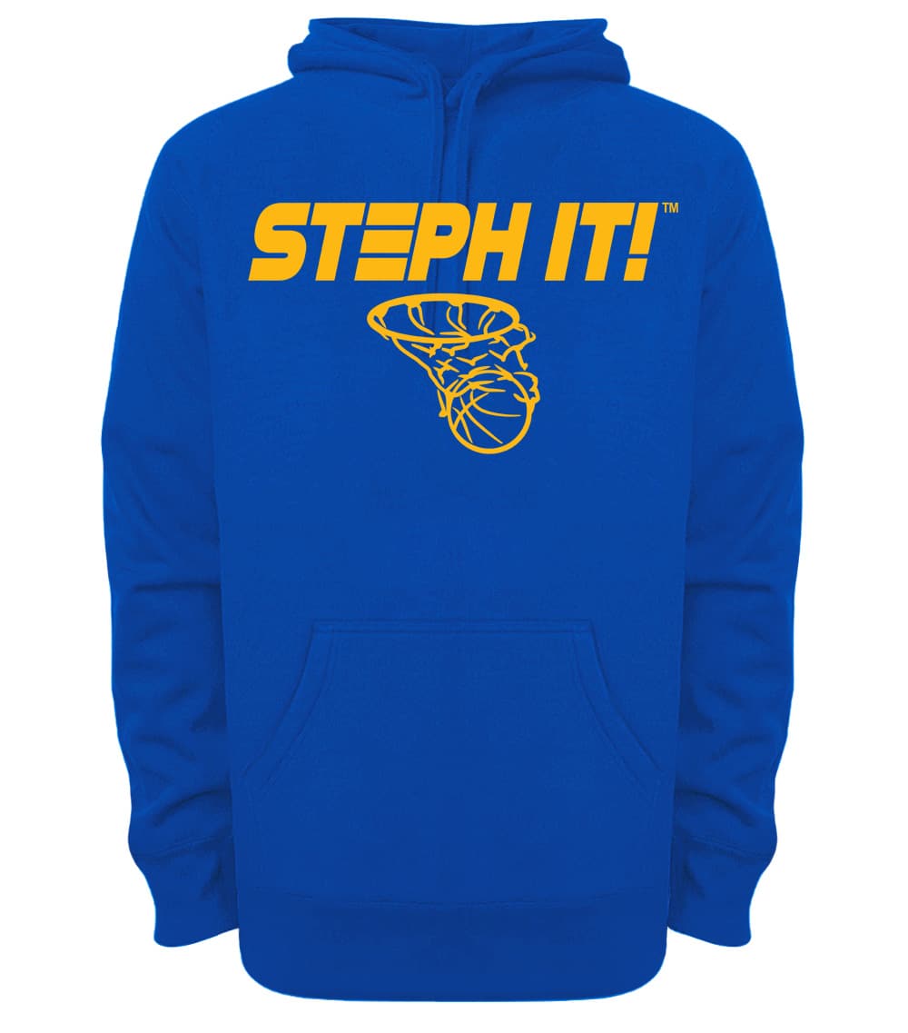 This premium blend hoodie displays 'Steph It!' Design #1. The fabric weight is 8.8 ounces and made from 65% ring spun cotton and 35% polyester. Wash on cold and air dry.