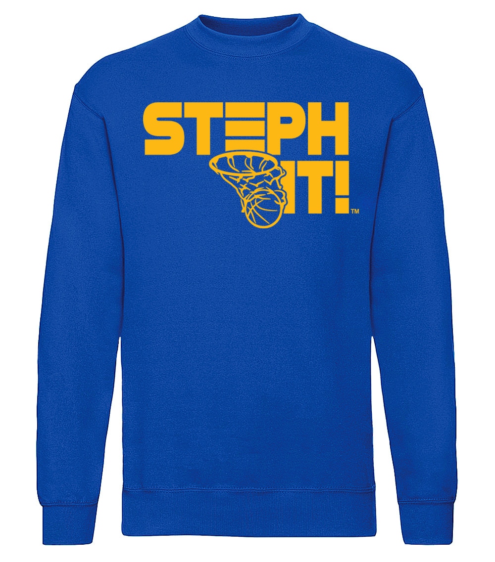 This premium blend sweatshirt displays 'Steph It!' Design #3. The fabric weight is 8.8 ounces and made from 65% ring spun cotton and 35% polyester. Wash on cold and air dry.