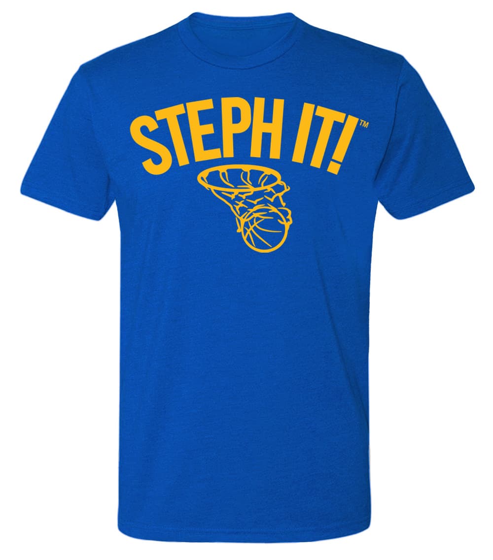This premium tri-blend short sleeve shirt displays 'Steph It!' Design #4. The fabric weight is 4.5 ounces and made from 25% ring spun cotton, 25% rayon, and 50% polyester. Wash on cold and air dry.